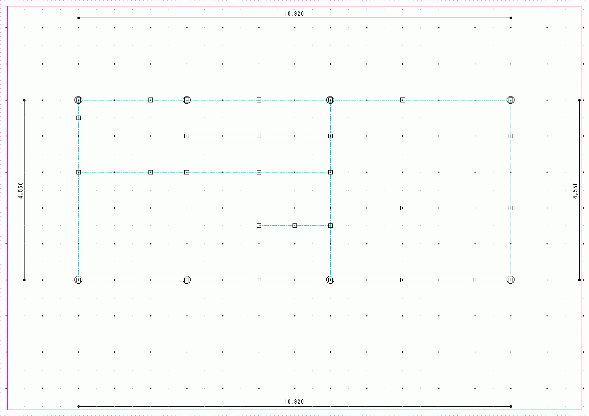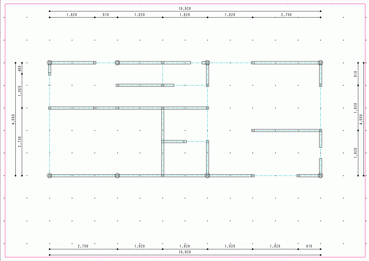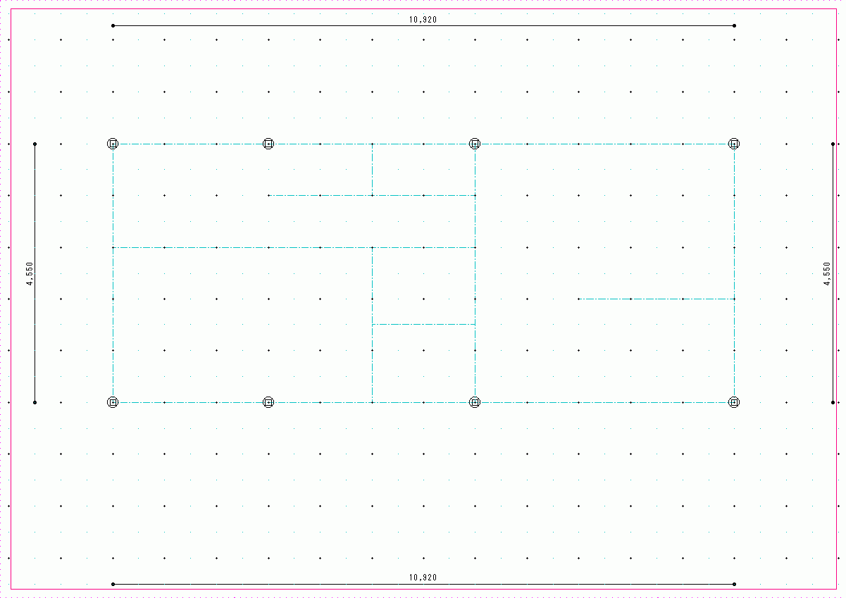 建物の基準となる壁中心線と通し柱が描けたところで、次は建物の内部を描きます。